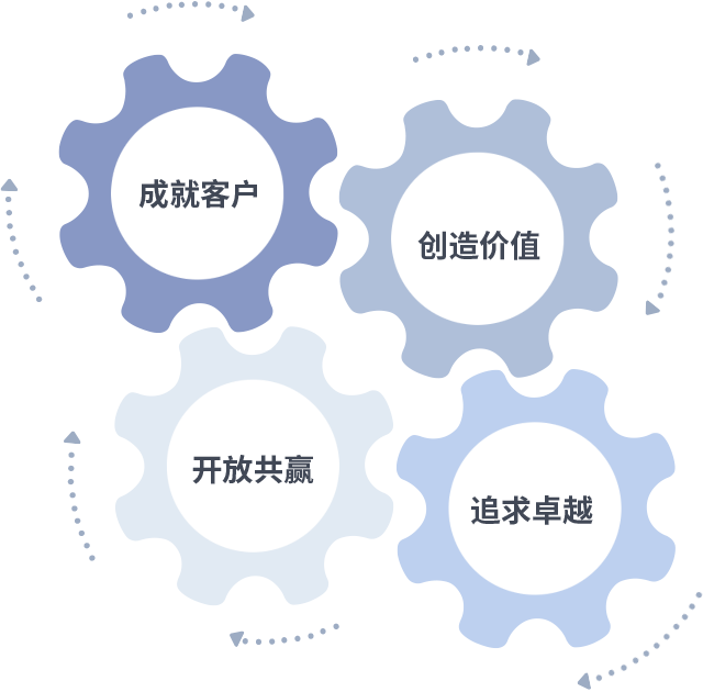 成就客户是一切决策的出发点,,,,创造价值是衡量所有工作的标准,,追求卓越是我们做事做人的态度,,,开放共赢是我们的格局也是最终的结果。。。价值观的齿轮环环相扣,,推动着组织里的每个人不断向前。。